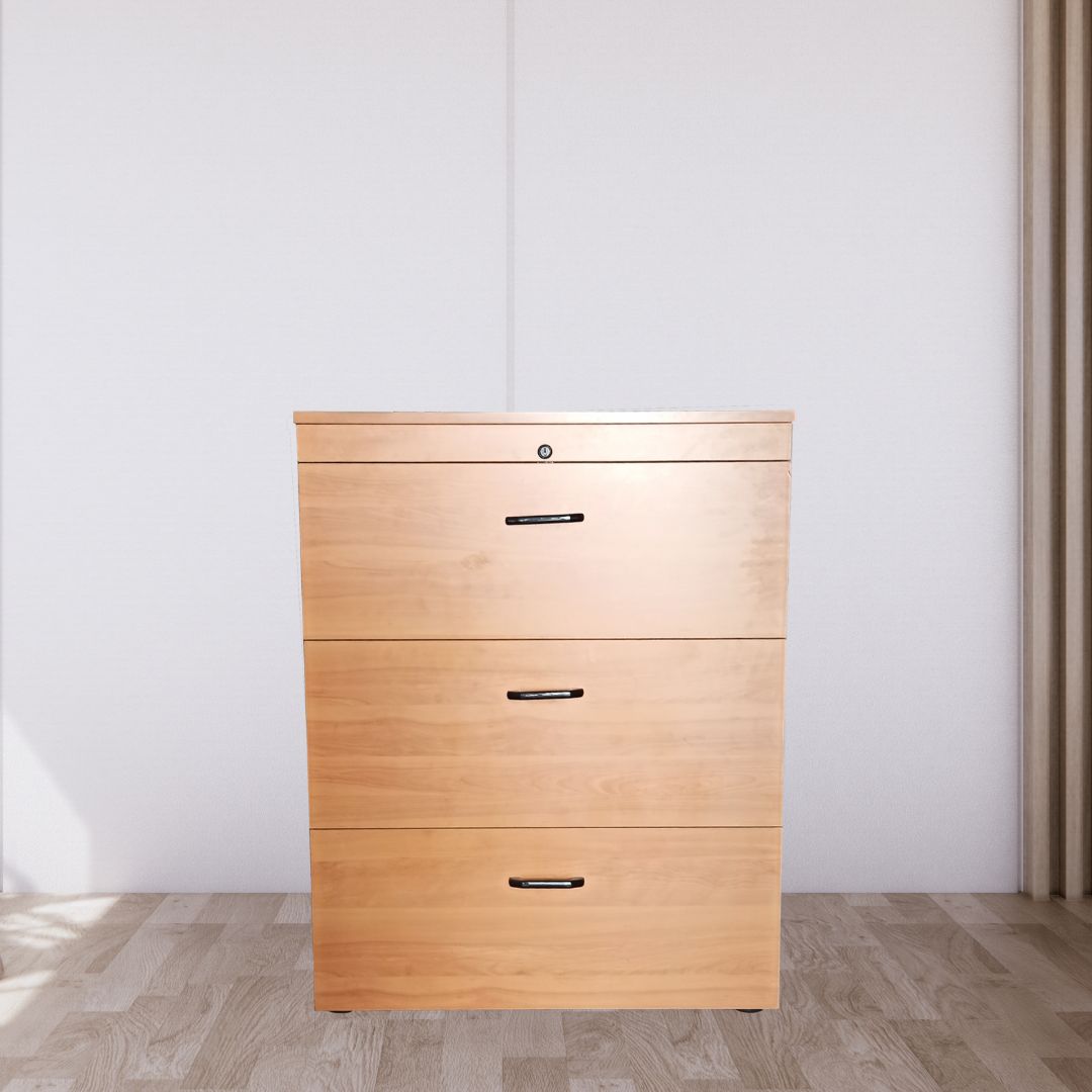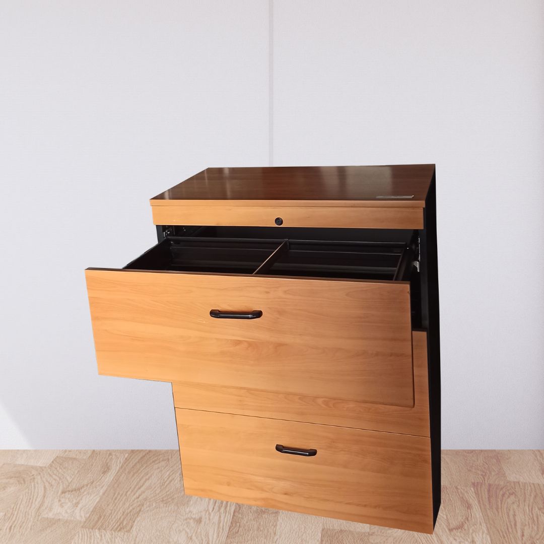 Armario archivador color peral y laterales en color negro. Tiene tres cajones amplios para carpetas colgantes y patas reguladoras de altura. Tenemos armarios, mesas y cajoneras a juego para amueblar oficinas.