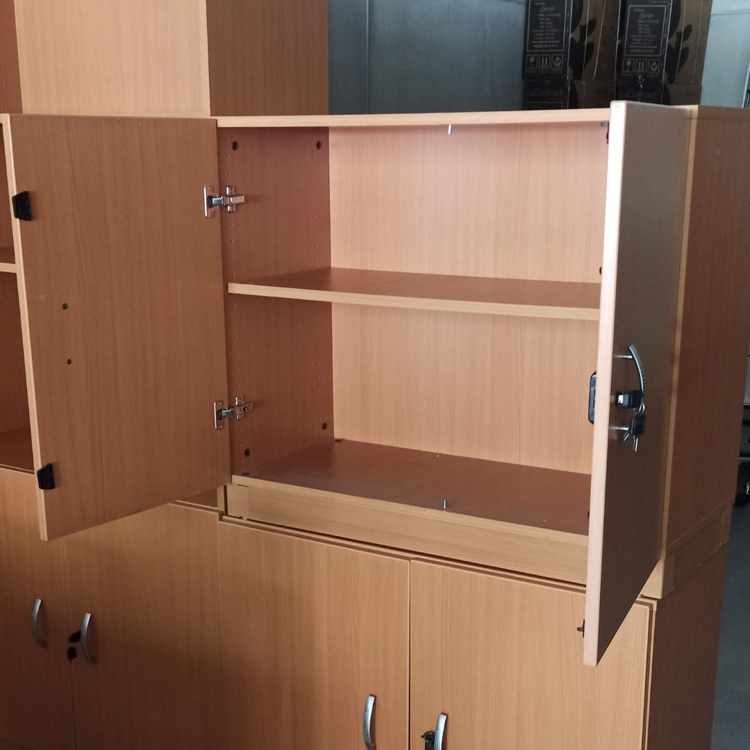 Armario bajo puertas batientes de Mobel Linea con estante interior . Un complemento elegante y práctico para el almacenaje de oficina. Disponemos de armarios altos, mesas y cajoneras a juego para amueblar tu oficina.