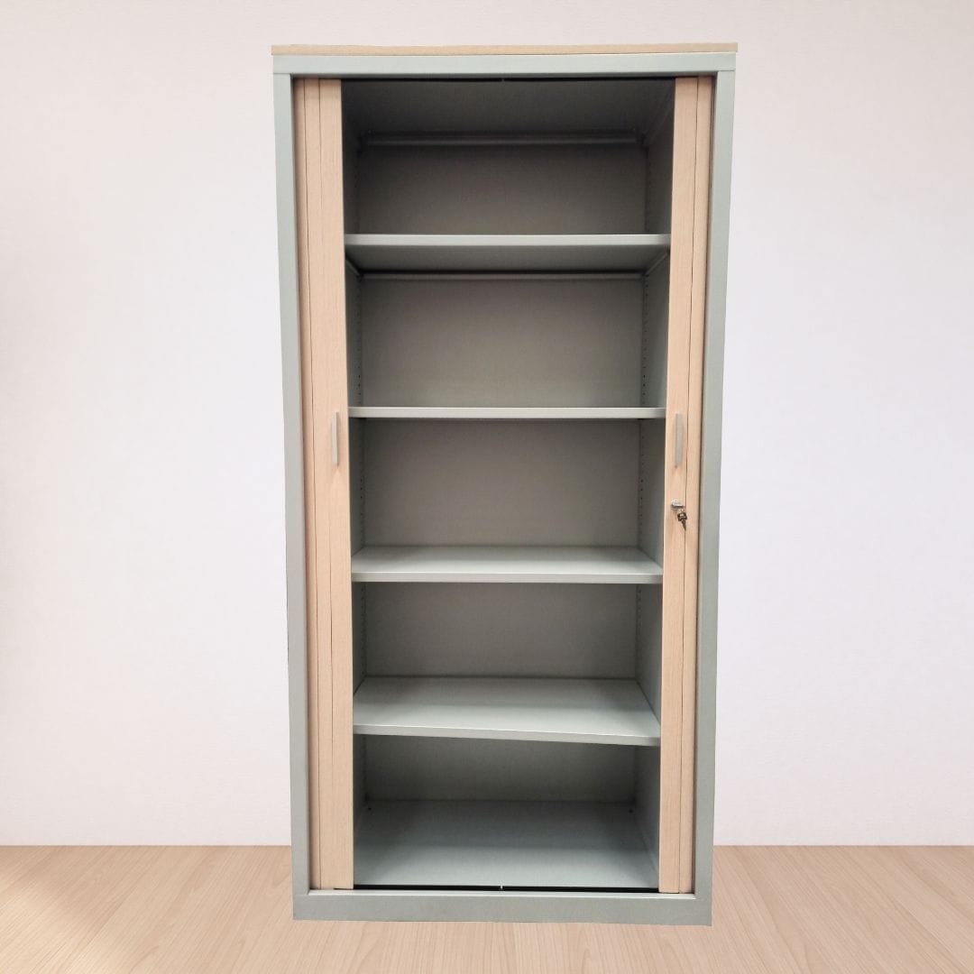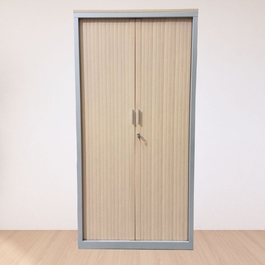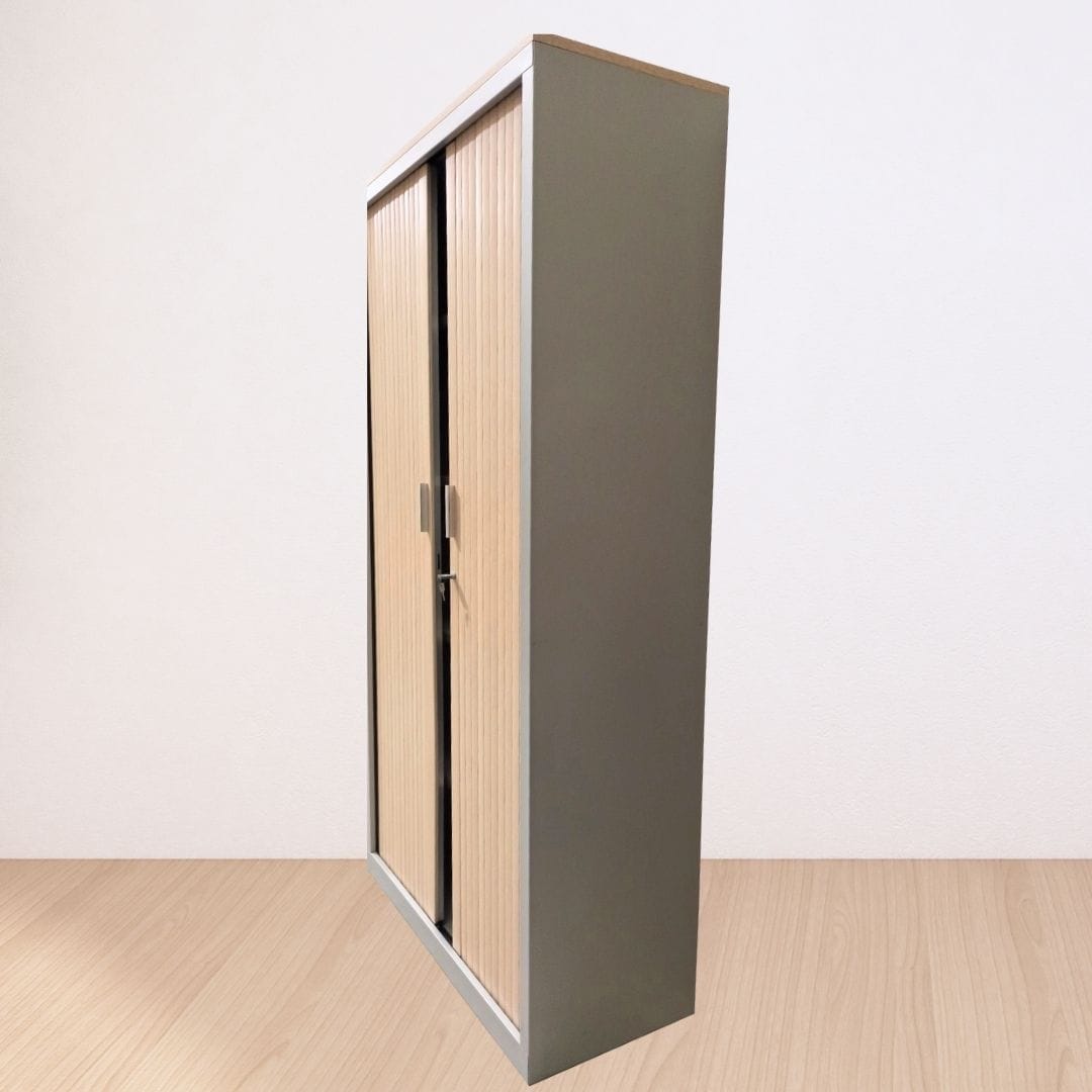 Armario metálico de Forma5, estructura metálica color gris con puertas de persiana color Haya, con tiradores metálicos y tapa de melamina color Haya en techo.