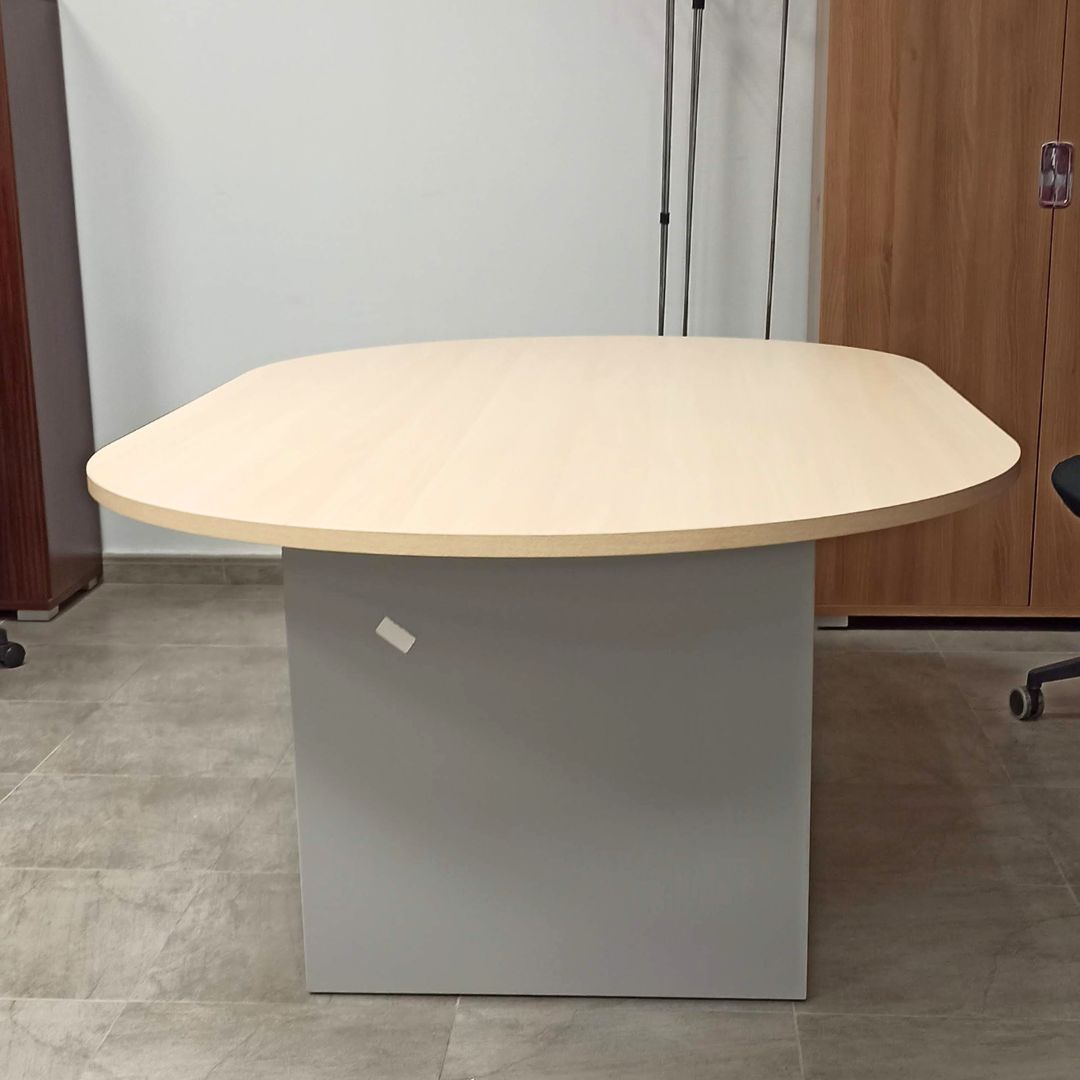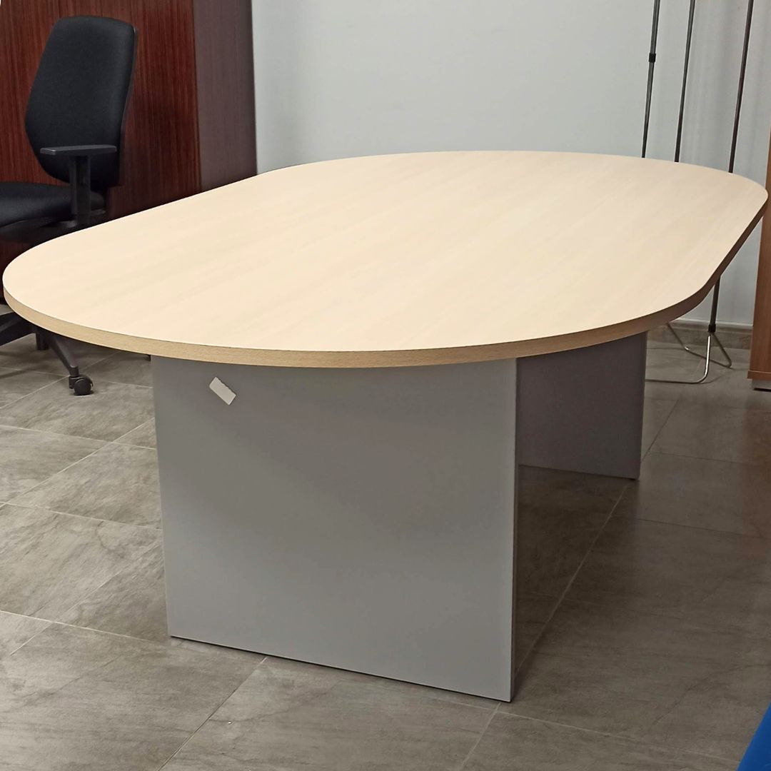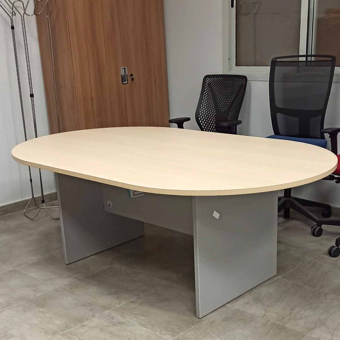 Mesa reunión ovalada de melamina con base en forma de H, con unas medidas de 200 x 120 cm. Perfecta para una sala de juntas con capacidad para 8 personas.