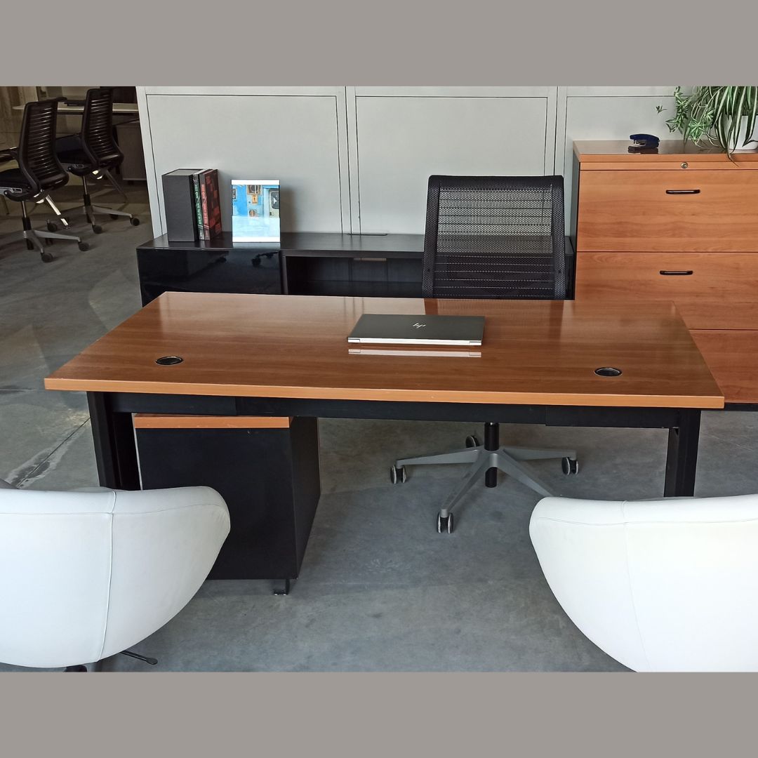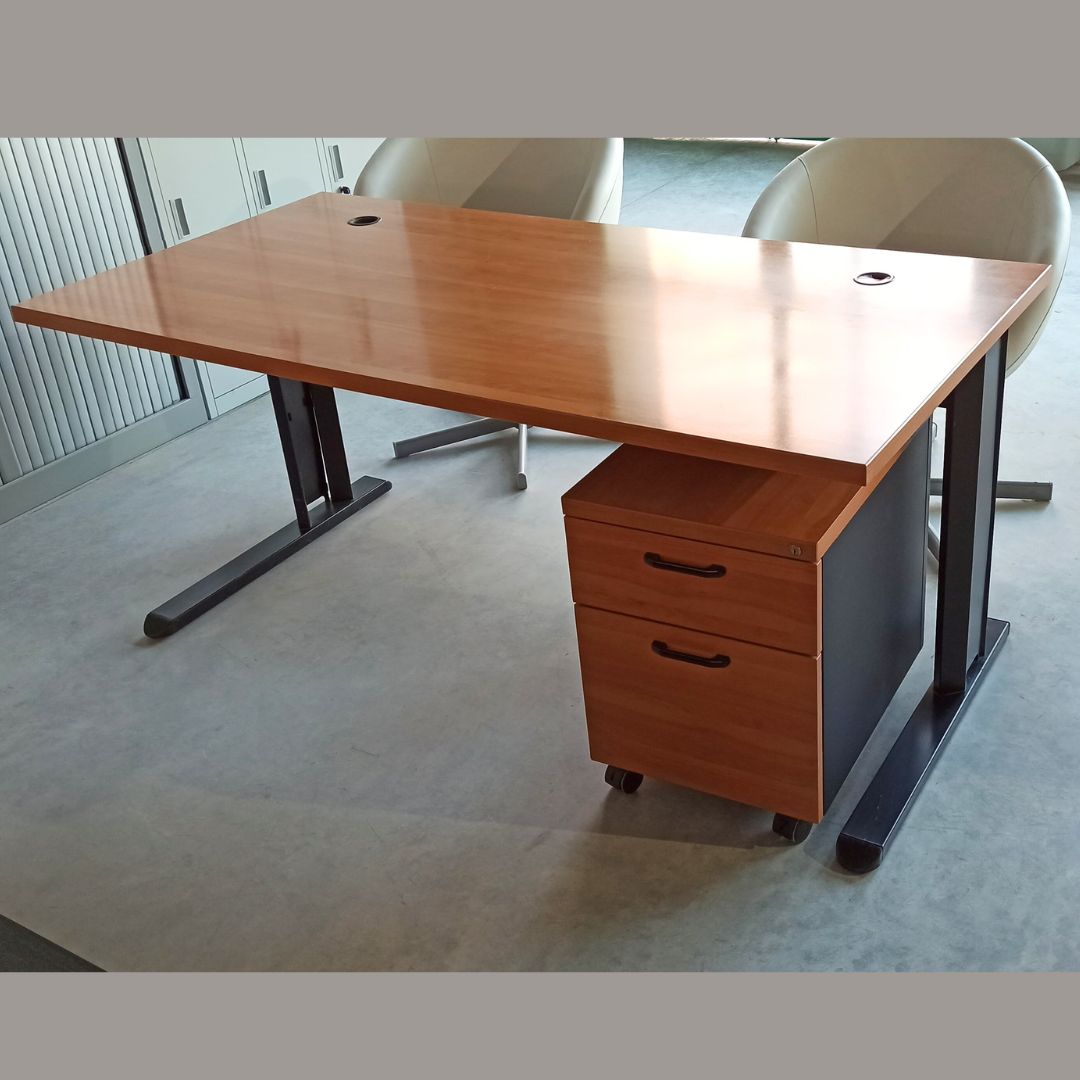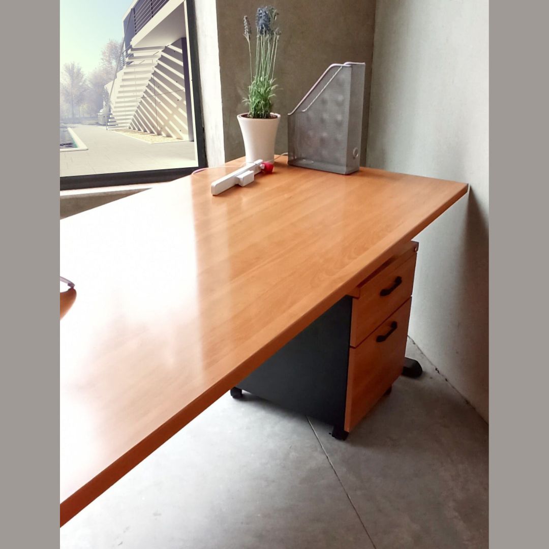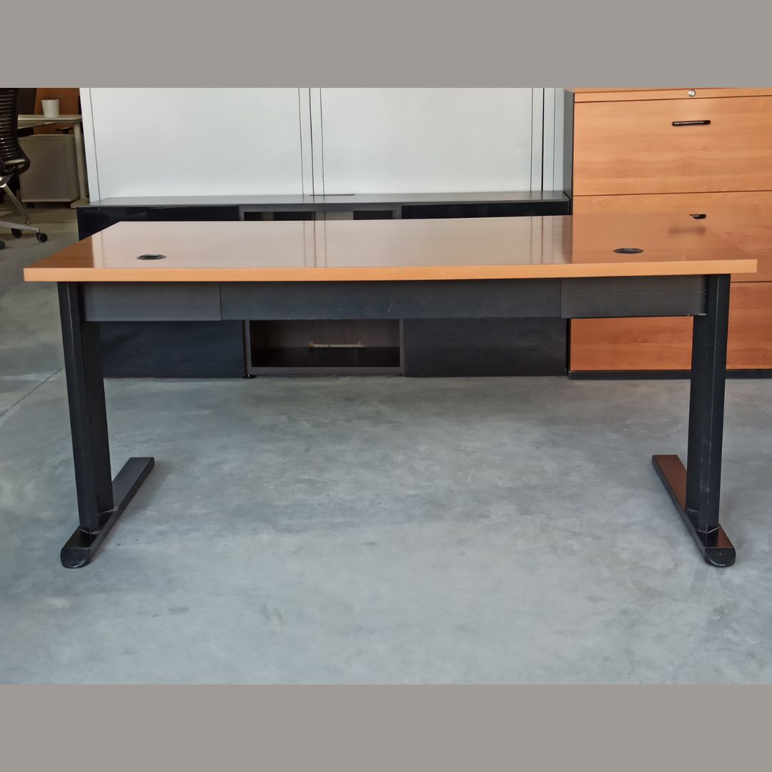 Mesas operativas color peral tablero de melamina con pasacables. Estructura metálica color negro. Sus medidas son perfectas como mesa de trabajo para oficina. También disponemos de armarios a juego.