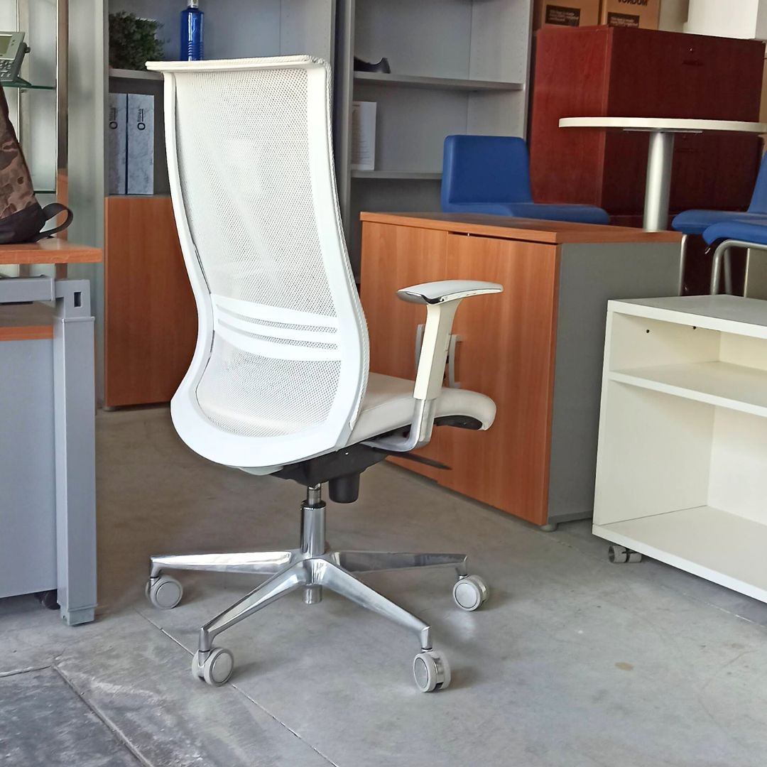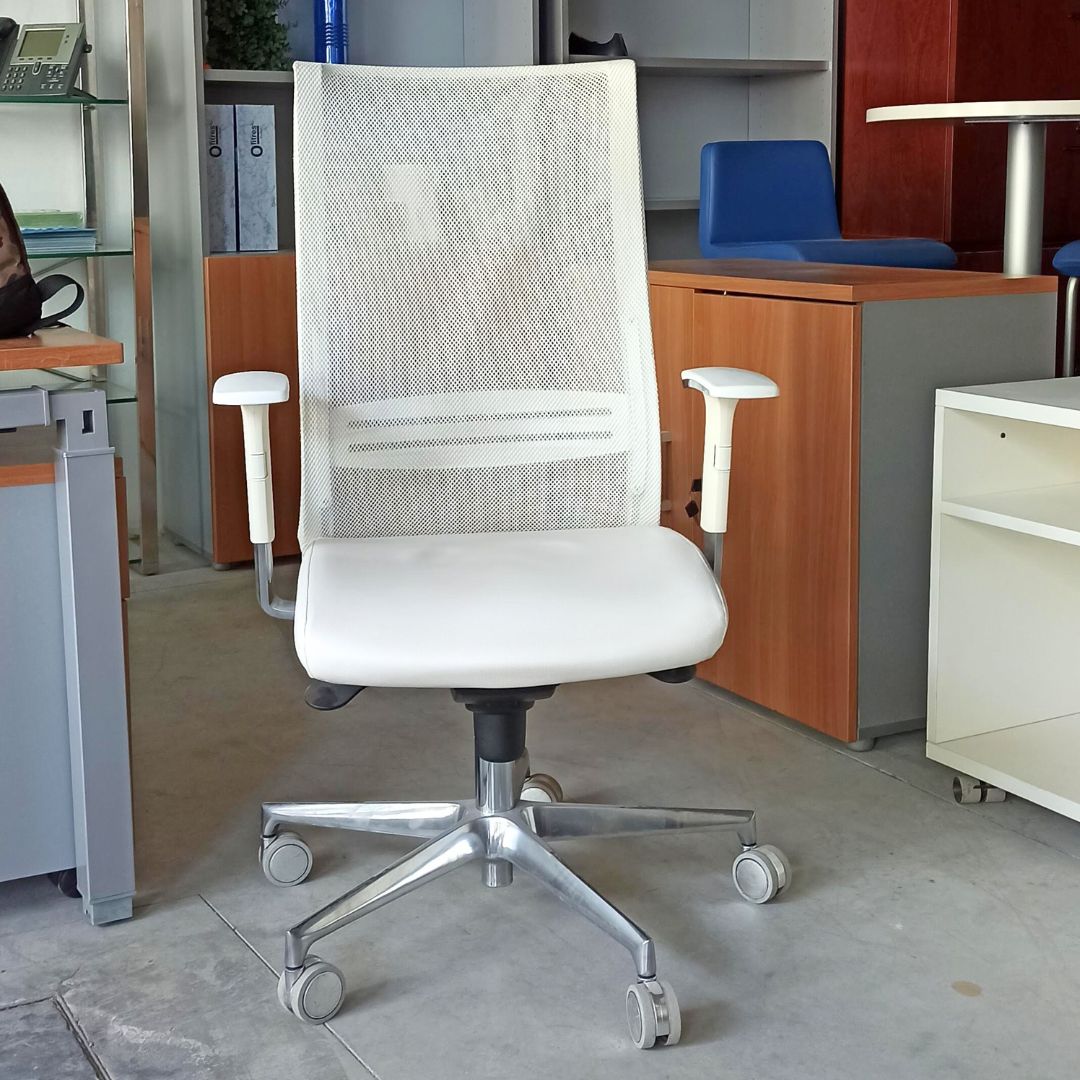 Silla de dirección ergonómica modelo Executive 779. Respaldo alto tipo red. Asiento en polipiel blanco. Regulación lumbar. Mecanismo Sincron Epron. Brazos regulables en altura de polipropileno con perfiles cromados. Base de aluminio pulido y ruedas cromadas.